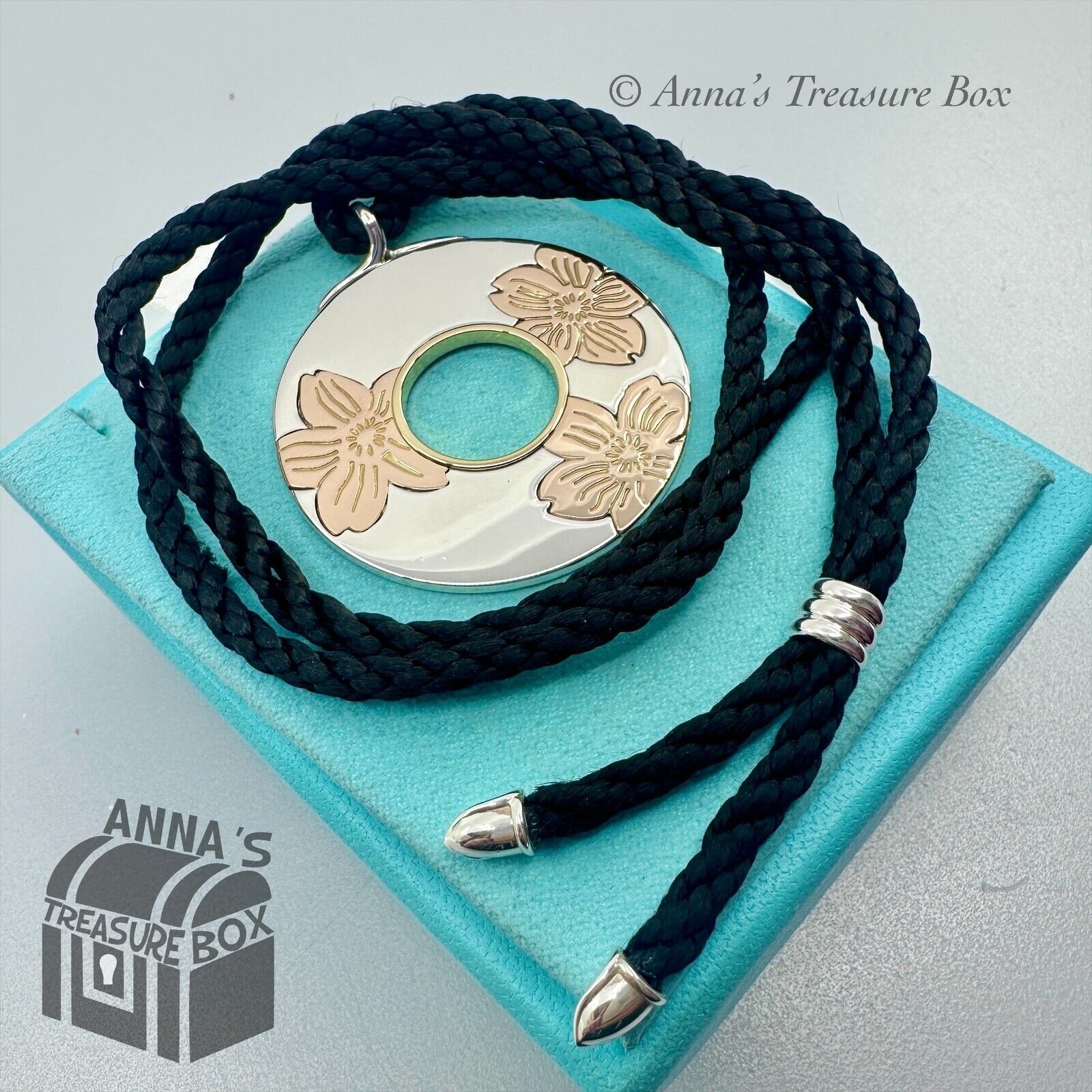 This is an authentic Tiffany & Co. 925 silver & 18k gold cherry blossom (sakura) flowers medallion necklace.