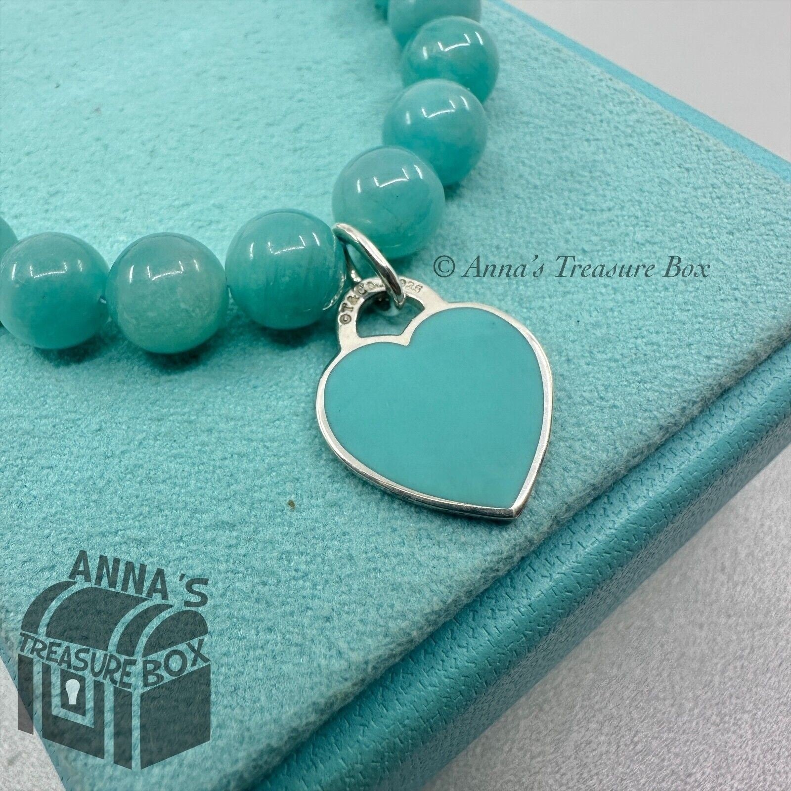 This is an authentic Tiffany & Co. 925 silver RTT heart tag 8mm Amazonite bracelet.